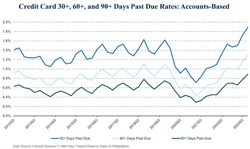 “Credit card performance further deteriorated at the end of 2023, with firms recording the worst 30+, 60+, and 90+ account-based days past due levels in the reporting series.”