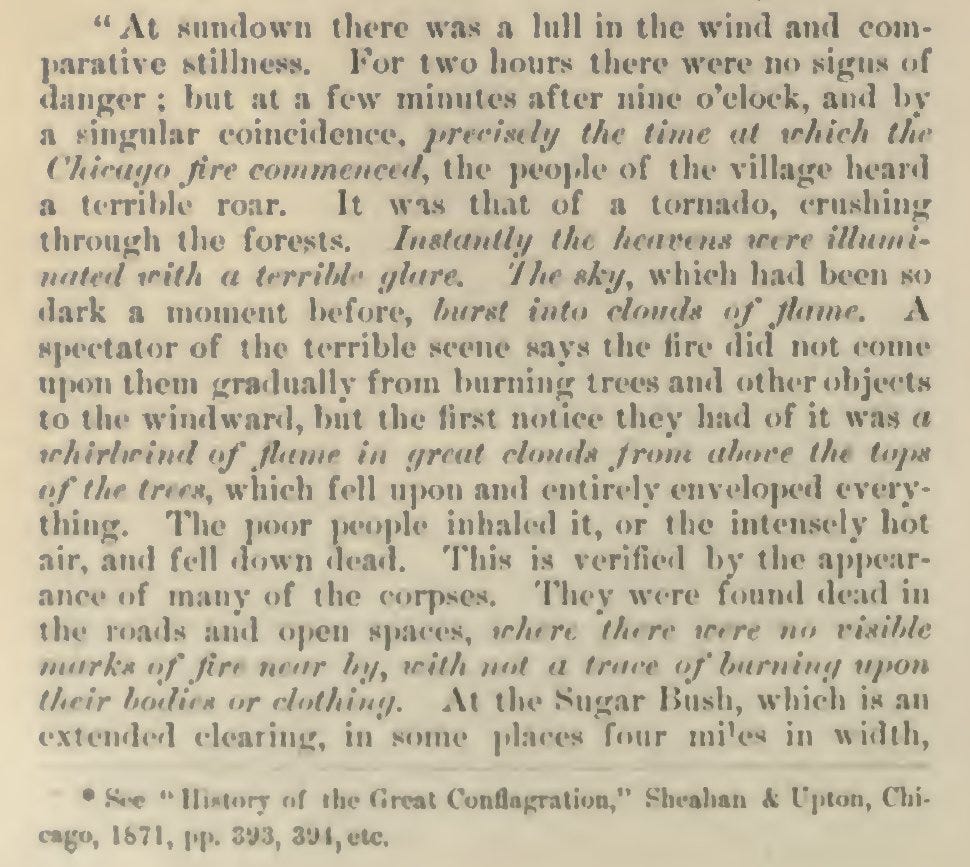 "At that hour, half past nine o'clock in the evening, at apparently the same moment, at points hundreds of miles apart, in three different states, Wisconsin, Michigan, and Illinois, fires of the most peculiar and devastating kind broke out, so far as we know, by spontaneous combustion."