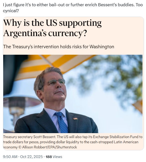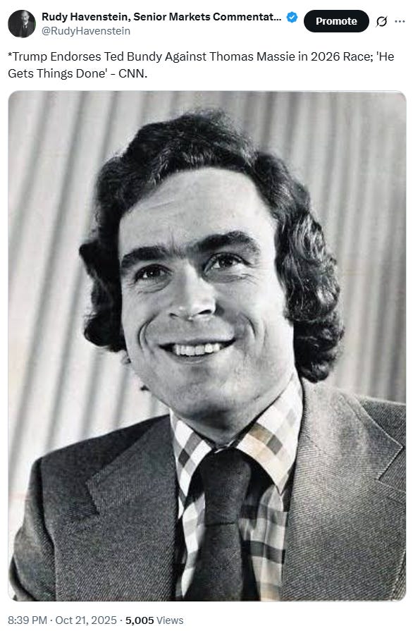 Rudy! Trump endorsing Ted Bundy had me laughing my butt off. Great work as always. Will you be writing about Bessent's bailout of Argentina? Looks like Scott was actually bailing out old friend Rob Citrone. Once again Socialism for the Rich.