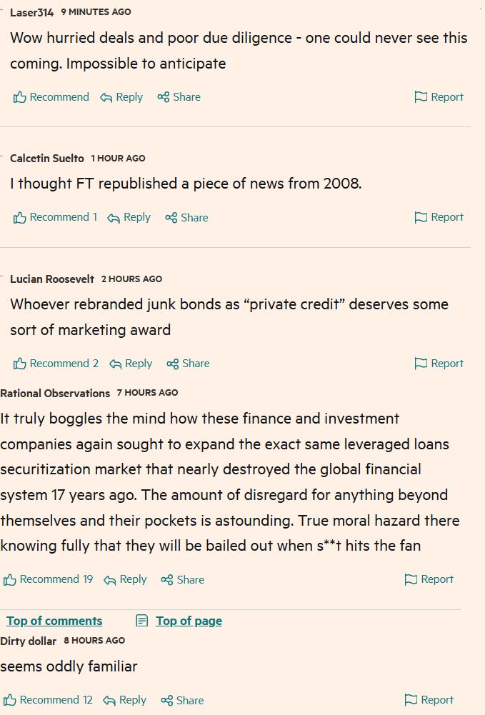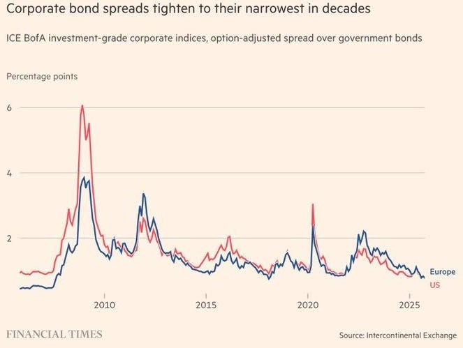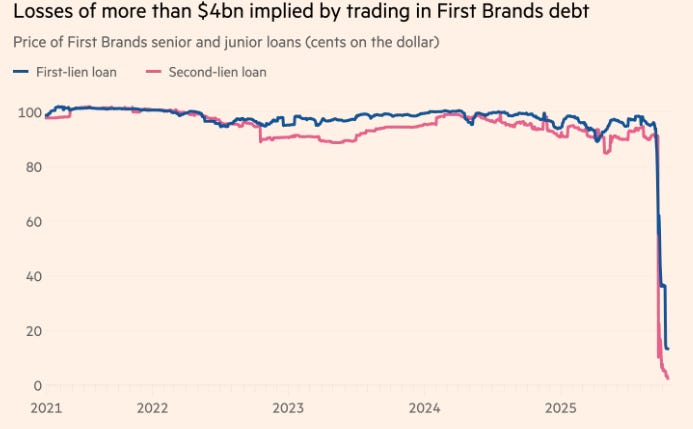 “Despite the troubles at First Brands and Tricolor and pockets of weakness starting to appear in the US economy, the strong demand for higher-yielding investments such as leveraged loans has kept spreads on risky corporate debt at near-record low levels. Leveraged loan issuance hit a record in the third quarter at $404bn…