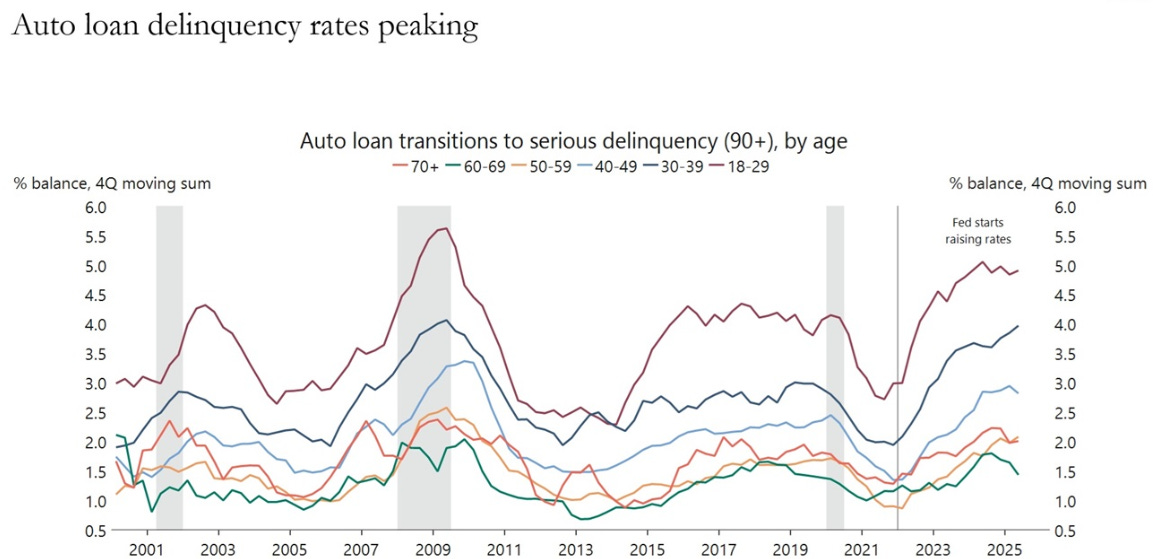 “The study found that 1.6% of total auto loans were 60 days or more past due as of July 2025, while credit card and first mortgage loan delinquencies are less than 1%. US consumers purchased about 16 million new cars last year and the majority were financed. There are close to 300 million cars on the road in America.