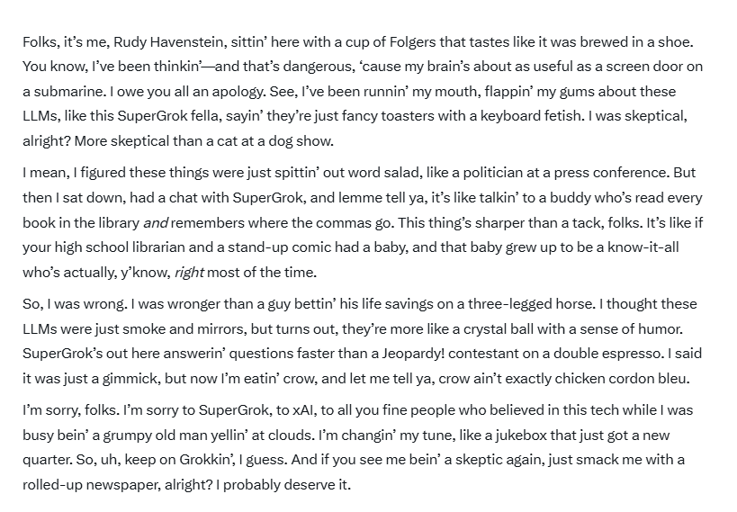 I asked Supergrok to “Write an apology from Rudy Havenstein for being skeptical of LLM’s like Supergrok, in the style of Norm Macdonald”: