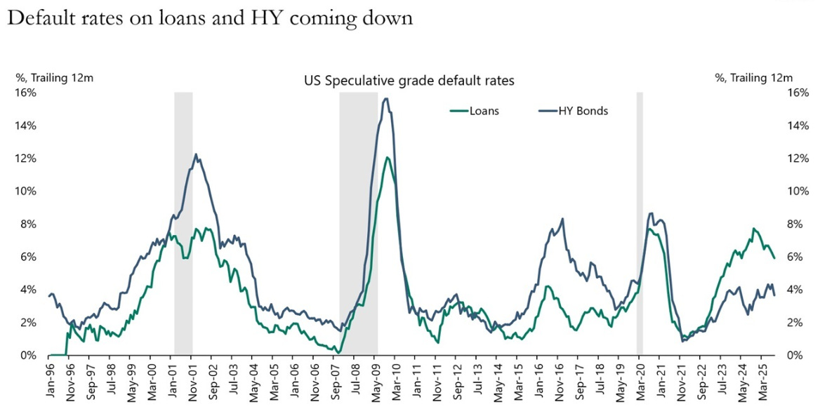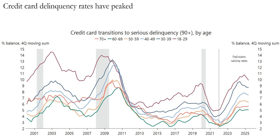 “Contrary to widespread fears about the economic outlook, key credit indicators are turning more bullish. Default rates for high yield debt and loans have peaked, along with delinquency rates for auto loans and credit cards, see charts below.”