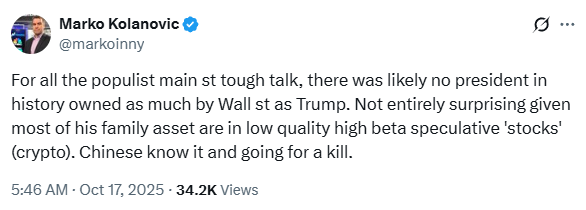 “When you get to low VIX levels, I start shaking, because I know if you have a Vol moment, these guys have to sell. Liberation Day was a function of the fact that Citadel and Millennium were all in, I think - I don’t know for a fact - but volatility came and they had no choice. They have no choice but to sell. It’s not like there’s a there’s a human making that decision. The risk manager says bring it down and so it goes.”