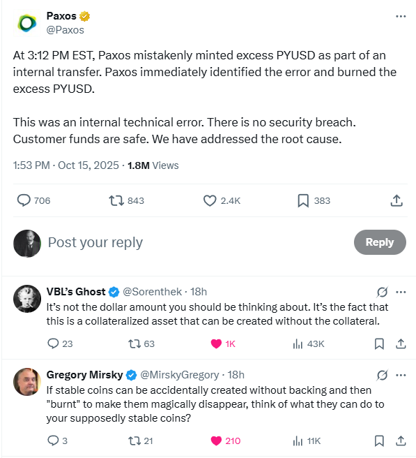 The error happened during an internal transfer due to what appears to be a decimal mistake — Paxos likely intended to mint $300,000 but ended up with $300 trillion because PYUSD has 6 decimals.”
