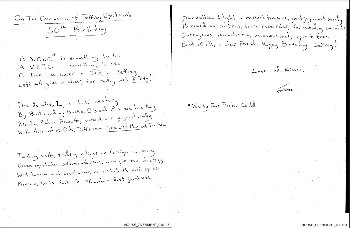 In early 2003, Mr. Black was among the friends who contributed to a book celebrating Mr. Epstein’s 50th birthday. Mr. Black’s entry, a handwritten poem, referred to Mr. Epstein’s “unique tax strategy” and his interest in women: “Blonde, Red or Brunette, spread out geographically / With this net of fish, Jeff’s now ‘The Old Man and the Sea.’””