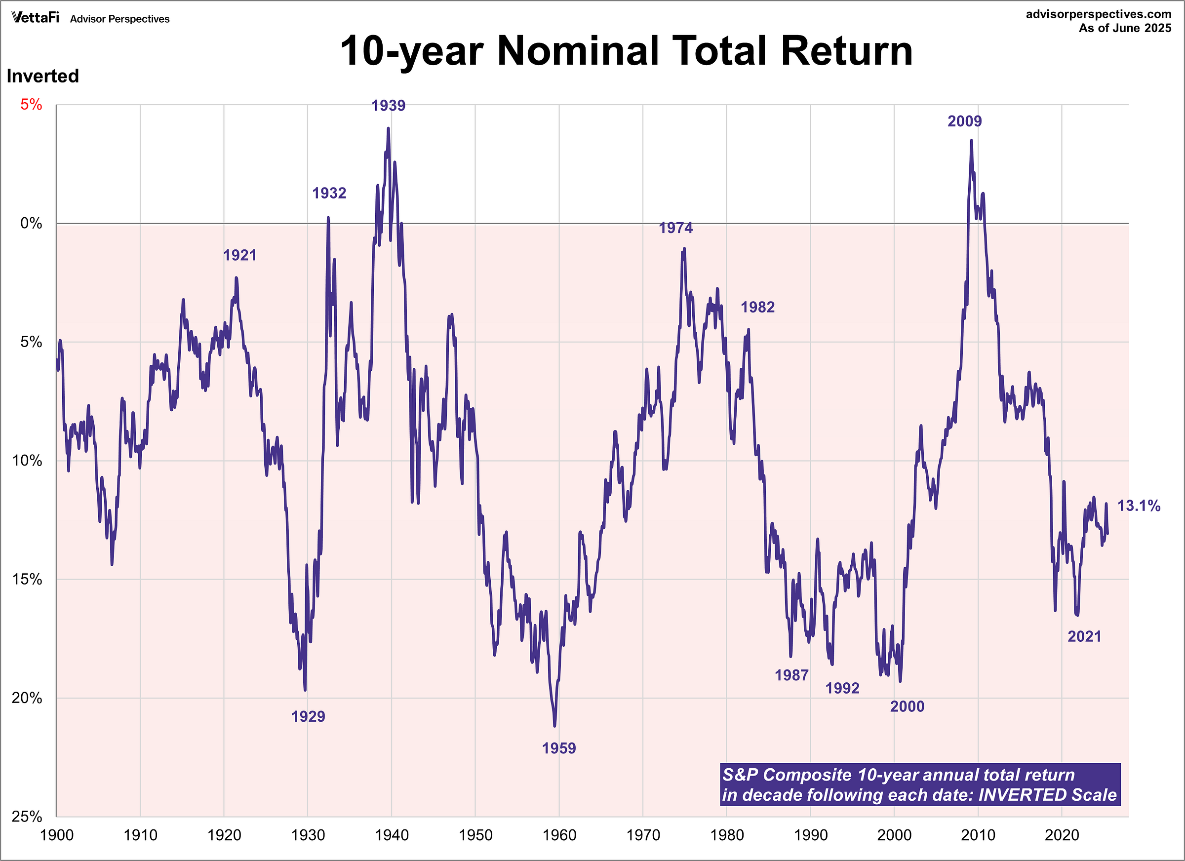 “Points of ‘secular’ undervaluation such as 1922, 1932, 1949, 1974 and 1982 typically occurred about 50% below historical mean valuations, and were associated with subsequent 10-year nominal total returns approaching 20% annually. By contrast, valuations similar to 1929, 1965 and 2000 were followed by weak or negative total returns over the following decade. That’s the range where we find ourselves today. Of course, we also won’t be surprised if the S&P 500 ends up posting weak or negative total returns in the 2007-2017 decade, which would require nothing but a run-of-the-mill bear market over the next couple of years.”
