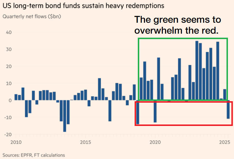 The U.S. 10-year is at 4.34%. I would not want to own 30-year (or 10-year) debt. I can understand buying those as a trade - e.g., you think rate cuts are coming due to a recession or mean Trump tweets - but other than that, nope.