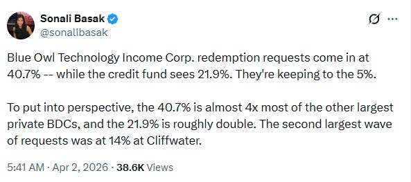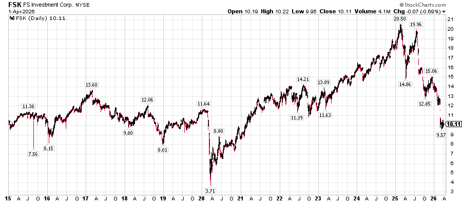Moody’s “lowered the debt rating of FS KKR Capital Corp one notch to BA1 from BAA3, pushing it into junk territory. Moody said the fund’s underlying asset quality had worsened more than its peers. Nonaccrual loans, meaning loans that borrowers have stopped making payments on, climbed to 5 and a half % of total investments at the end of 2025, one of the highest rates among rated business development companies according…5.5% is astronomical. That is a ridiculously high number. Ridiculously high number. That basically puts them in financial jeopardy. And that’s why Moody’s is downgrading it to junk.”