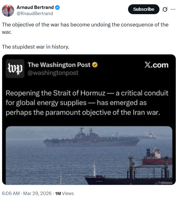 All of those countries that can’t get jet fuel because of the Strait of Hormuz, like the United Kingdom, which refused to get involved in the decapitation of Iran, I have a suggestion for you: Number 1, buy from the U.S., we have plenty, and Number 2, build up some delayed courage, go to the Strait, and just TAKE IT. You’ll have to start learning how to fight for yourself, the U.S.A. won’t be there to help you anymore, just like you weren’t there for us. Iran has been, essentially, decimated. The hard part is done. Go get your own oil! President DJT