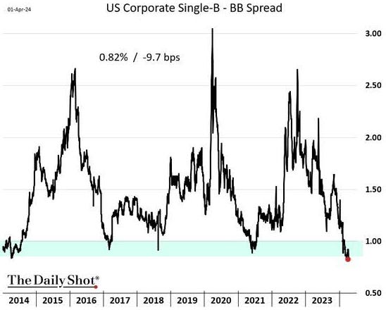 So it looks from the first chart that people don’t see much difference in risk between B and BB bonds at this time, although the risk of default by B’s is over 3x greater. i.e., complacency.