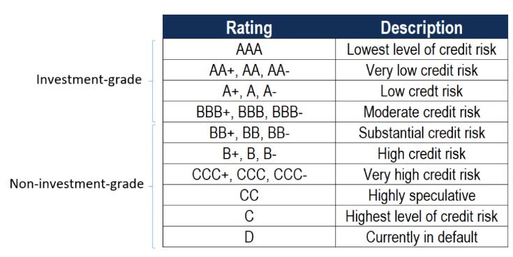 “S&P Global reported that the highest one-year default rate for AAA, AA, A, and BBB-rated bonds (investment-grade bonds) were 0%, 0.38%, 0.39%, and 1.02%, respectively. It can be contrasted with the maximum one-year default rate for BB, B, and CCC/C-rated bonds (non-investment-grade bonds) of 4.22%, 13.84%, and 49.28%, respectively.”