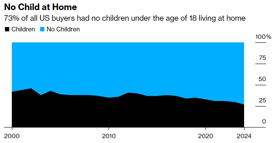 “An increasing share of homeowners are either childless or empty nesters, with 73% of all buyers having no child under 18 at home this year, up from 70% last year.”