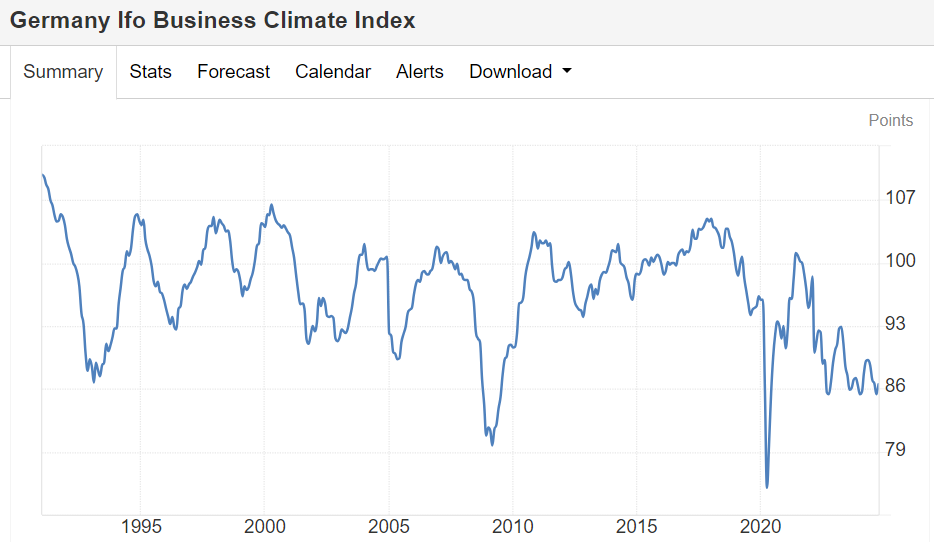 “Over the past three years, Europe’s largest economy has slowly but steadily sunk into crisis. The country has seen no meaningful quarterly real GDP growth since late 2021, and annual GDP is poised to shrink for the second year in a row. Industrial production, excluding construction, peaked in 2017 and is down 16 per cent since then. According to the latest available data, corporate investment declined in 12 of the past 20 quarters and is now at a level last seen during the early shock of the pandemic. Foreign direct investment is also down sharply.