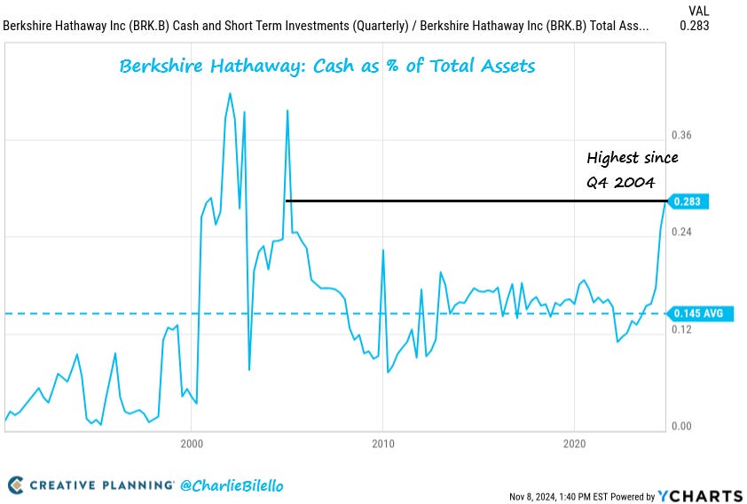 “Berkshire Hathaway is now holding over 28% of their Assets in Cash, the highest % since 2004. Historical average cash position: 14%.”
