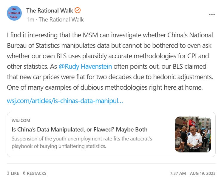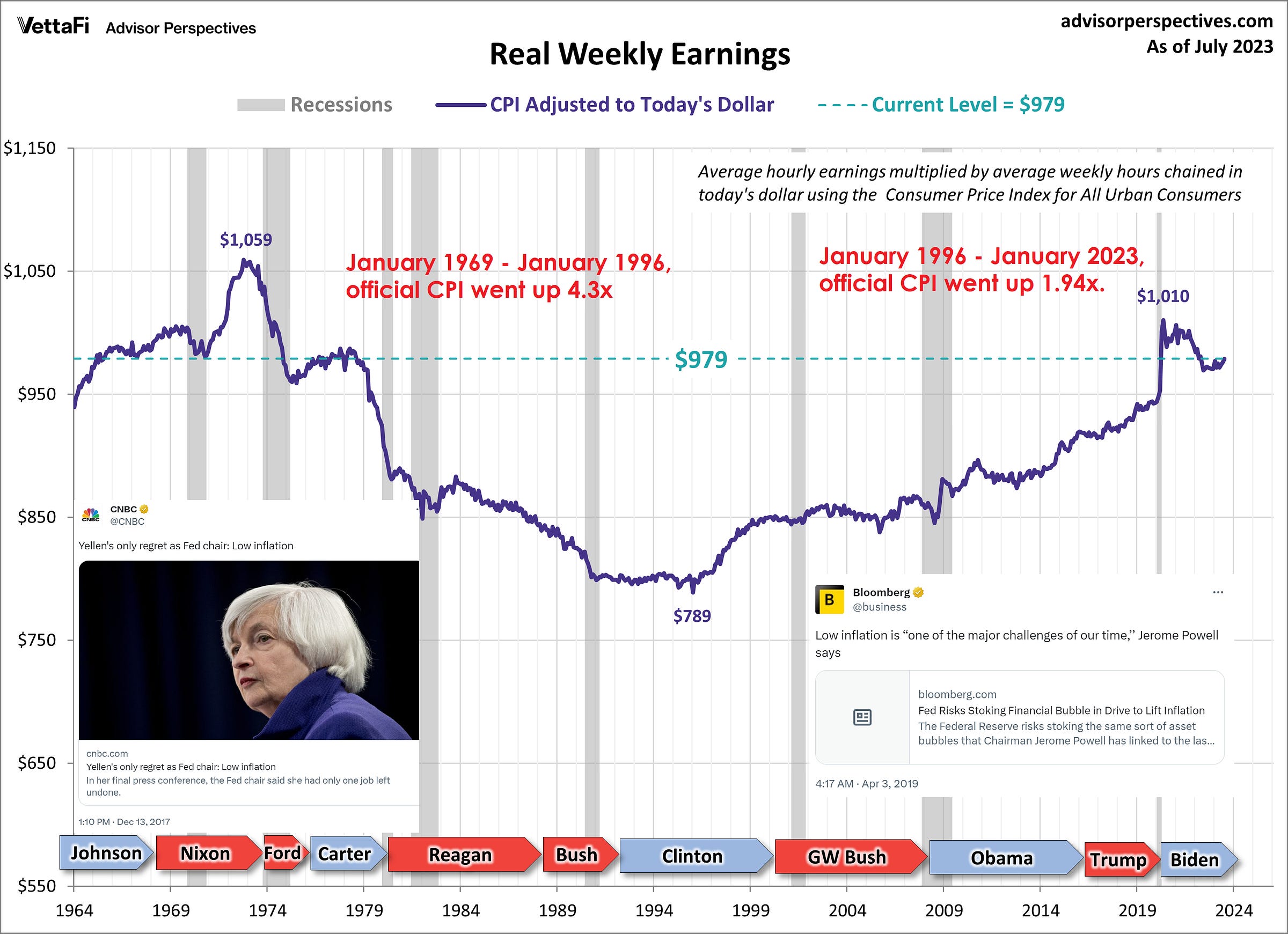 An important point about the above chart: The CPI of 2023 is NOT the same as the CPI of 1969. Over the years the BLS has made hedonic-quality, substitution and other adjustments, always to lower the reported number. The CPI is a model, not a cost of living reality. The situation is much worse than depicted above.