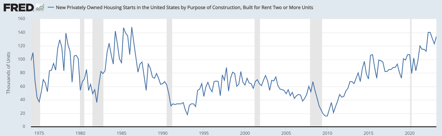 New Privately Owned Housing Starts in the United States by Purpose of Construction, Built for Rent Two or More Units
