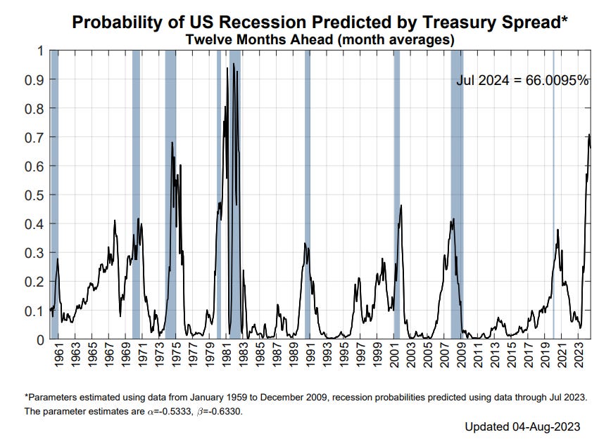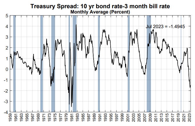 This model uses the slope of the yield curve, or “term spread,” to calculate the probability of a recession in the United States twelve months ahead. Here, the term spread is defined as the difference between 10-year and 3-month Treasury rates.