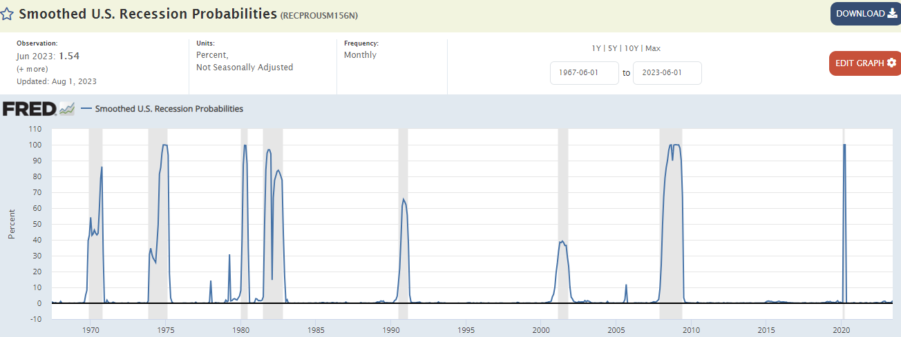If those charts aren’t enough, there’s this from the St. Louis Fed, the “Smoothed U.S. Recession Probabilities” chart, which seems unmatched in its ability to tell us when we are actually in a recession, though giving no warning.