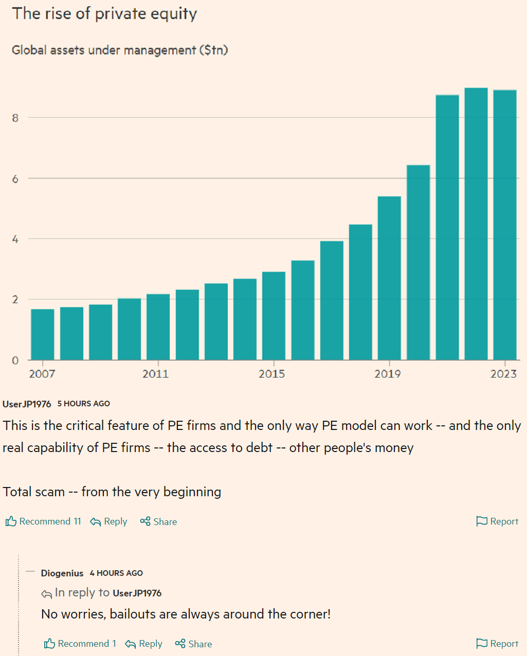 “Private equity firms have become an integral part of the global economy, owning everything from family homes to supermarkets and cosmetics companies — even hospitals. Assets controlled by groups such as Blackstone, Apollo Global Management and Carlyle Group have quadrupled since 2012, to about $8tn. As the size of the private equity industry has grown, so too has the debt it uses to buy companies, enabled by a decade of ultra-low interest rates.”