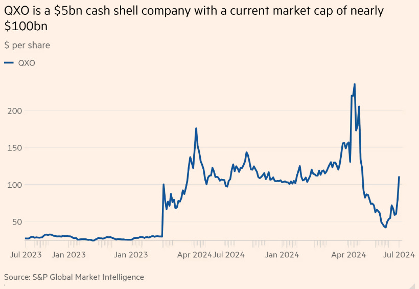 Brad “Jacobs struck his investment at $4.57 per share. Other investors bought it at twice that, $9.14. The rebranded SilverSun, now officially known as QXO, has 740mn shares outstanding accounting for warrants and convertible stock. Yet its traded stock price is now above $100 per share, implying that the $5bn pot of cash has an equity value of nearly $100bn.”