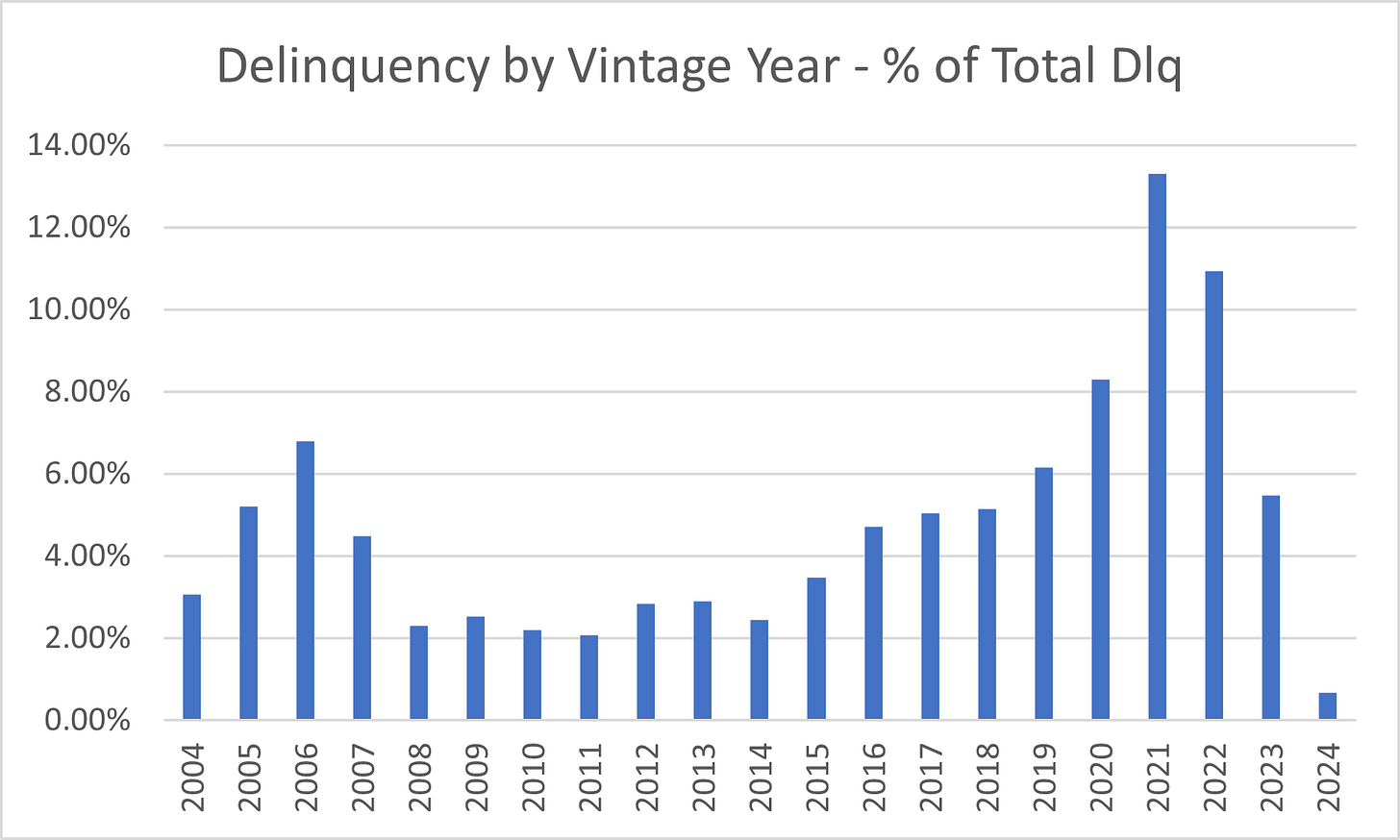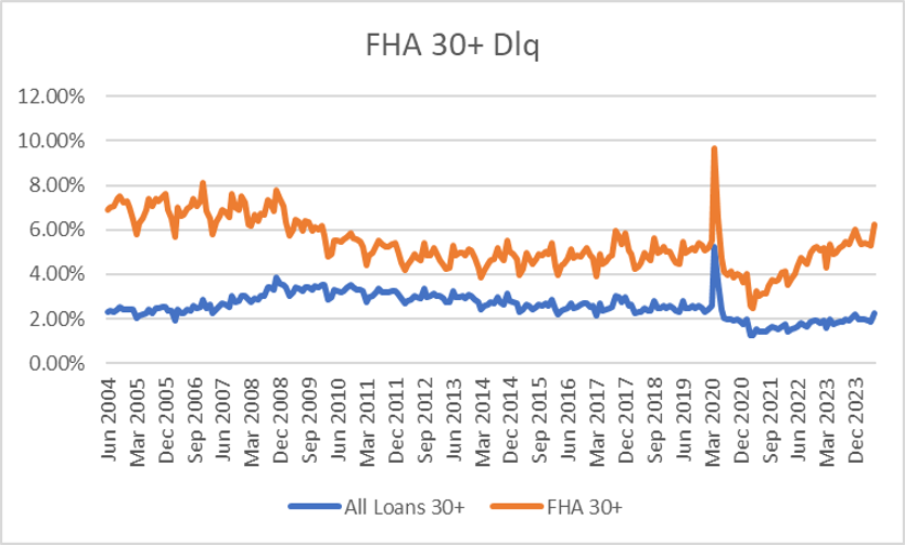 “I have been warning about the trend in FHA for some time. That current 30+ delinquency rate is a tad higher than February 2008. Despite the historic forbearances (18 months), 40-year modification, the partial claim and the partial claim and mod combo, FHA borrowers simply cannot keep up due to increasing taxes, insurance and homeowner expenses. Additionally, we know that there were those that used the FHA low downpayment loans for investment properties fraudulently, and many of those are no longer or were never cash flowing. You will see that the largest percentages of delinquency are in the newer origination years and increasing rapidly:”