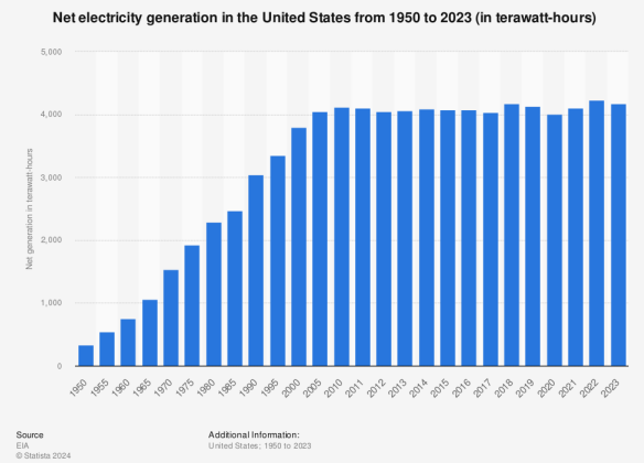 “On the supply side, the U.S. produced 4,055 TWh of electricity in 2005. Last year the figure was 4,178 TWh. Essentially zero increase in 18 years.”