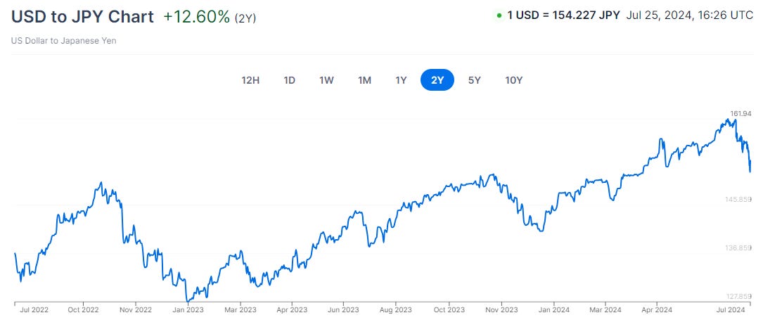 Indeed, the yen’s ferocious post-Covid selloff, which culminated in a 162:1 exchange rate on July 3 from 103:1 less than four years ago, has likewise stung local consumers and retailers alike. Witness the near 70% rise in import prices since the start of 2021, as well as 26 months and counting of declining real wages per government compiled data. Earlier today, a Labor Ministry-led panel bumped the national minimum wage by some 5% to ¥1,504 ($6.85) per hour, the largest annual increase on record.
