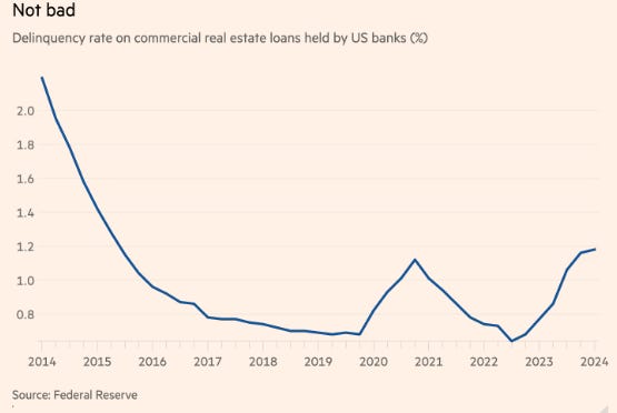 “Imogen Pattison of Capital Economics estimates there are $1.2tn in CRE loans coming due this year and next. Those borrowers may not have time to wait for the return of low rates. She points out that delinquency rates on bonds backed by commercial mortgages are much higher than for CRE bank loans — approaching 6 per cent, compared with a financial crisis peak of 10%. She expects CRE distress to increase in the months to come. REITs have recovered remarkably well. But CRE seems likely to provide a few more ugly surprises before the rate cycle bottoms.”