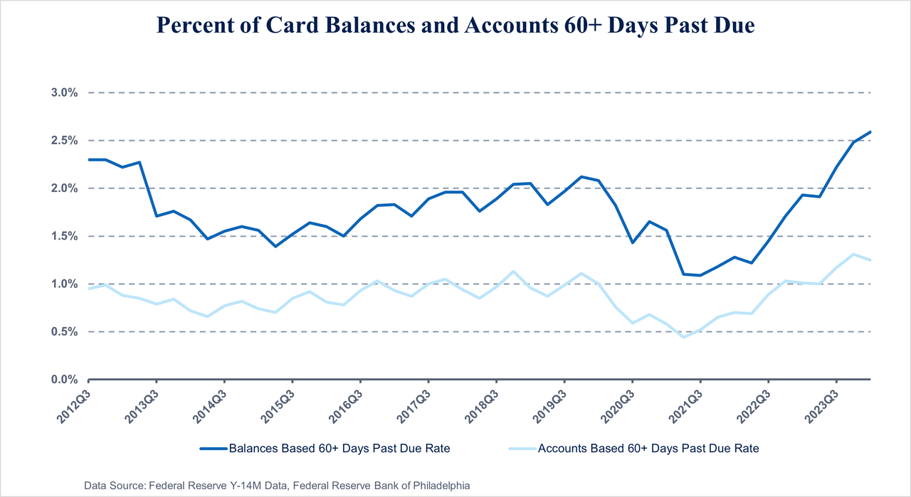 “All measures of balance-based credit card delinquency rates posted their highest levels in the nearly 12-year history of the series in the first quarter. Meanwhile, the total number of credit card accounts 30, 60, and 90 days past due declined for the first time in a year, following typical seasonal trends.