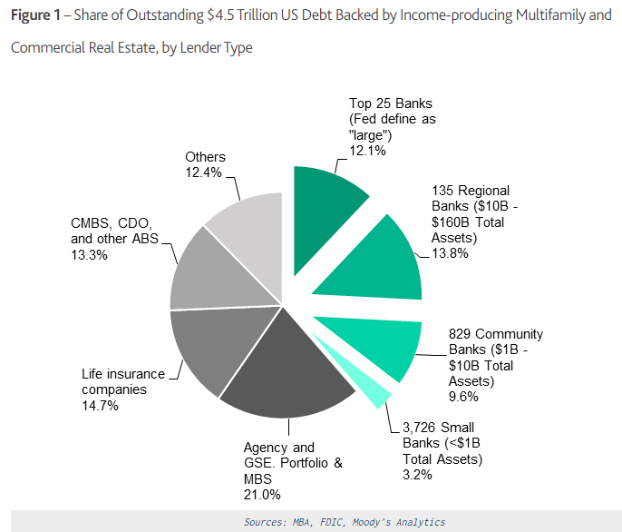 Figure 1 illustrates the CRE lending pie in the US. Overall, banks are the largest lender, accounting for 38.6% of lending. However, the 135 US regional banks (generally considered as those with about $10 billion to $160 billion in assets) hold just 13.8% of debt on income-producing properties. The top 25 largest banks, which the Federal Reserve (Fed) considers “large”, hold 12.1%. The 829 community banks (with $1 billion to $10 billion of assets) hold 9.6%, and the remaining 3.2% is spread among the 3,726 very small local banks with less than $1 billion in assets.