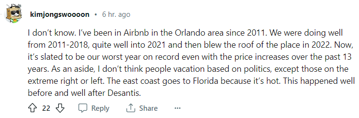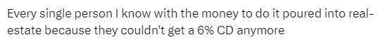 I stayed at a beach house a friend booked over Labor Day weekend and ended up talking with the agent that let us into the place. He said their bookings were down 60% compared to last Labor Day weekend and the house we got for $800 went for $2200 the previous year. Even better, I popped on realtor.com and the house was listed for $700,000 (there was a sale sign out front), down from 1.1mil 18 months ago. Drop after drop. I also realized that they were renting the garage for RV storage. Someone's taking an absolute bath on that place, and apparently a LOT of places in the tourist town I went to.