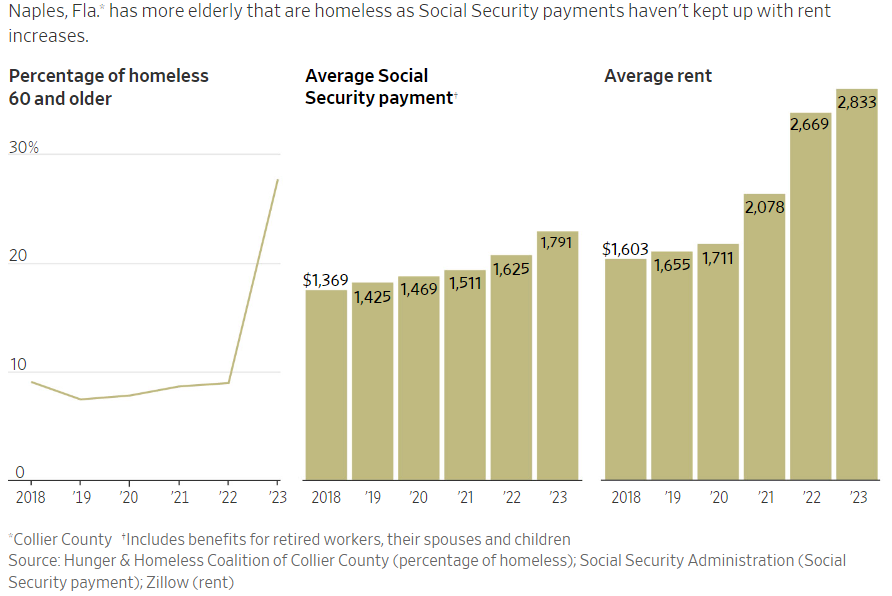 In Naples, a typical rental cost $2,833 in July, according to Zillow data. The average Social Security payment for retired workers and their dependents that month was $1,791, according to federal data.