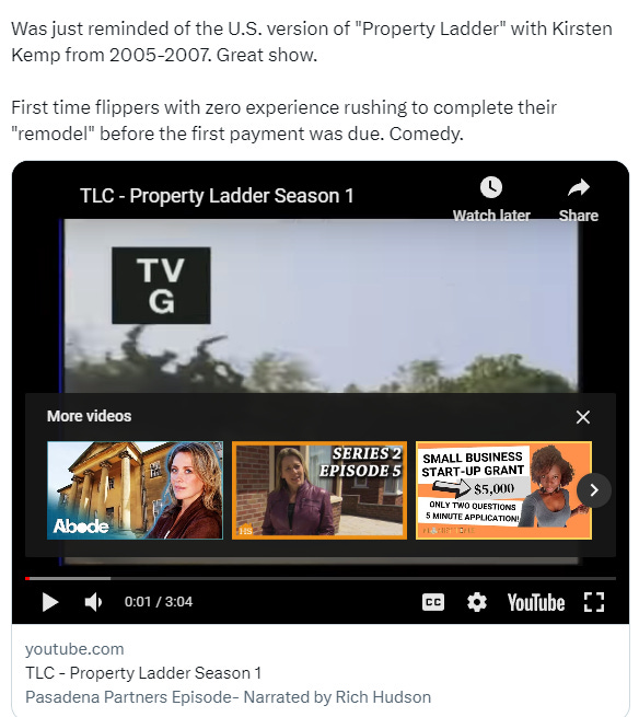 “Property Ladder” was a hilarious show that just screamed “housing bubble.” Another fave a few years later was “Jungle Gold,” which was nothing but a series of bad ideas, one after another. Should be required viewing in schools.