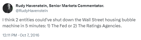 “…Eisman and his team were so certain the world had been turned upside down that they just assumed Raymond McDaniel must know it, too. "But we're sitting there," recalls Vinny, "and he says to us, like he actually means it, 'I truly believe that our ratings will prove accurate.'" And Steve shoots up in his chair and asks, 'What did you just say?'--as if the guy had just uttered the most preposterous statement in the history of finance. He repeated it. And Eisman just laughed at him. "With all due respect, sir," said Vinny deferentially, as they left, "you're delusional."