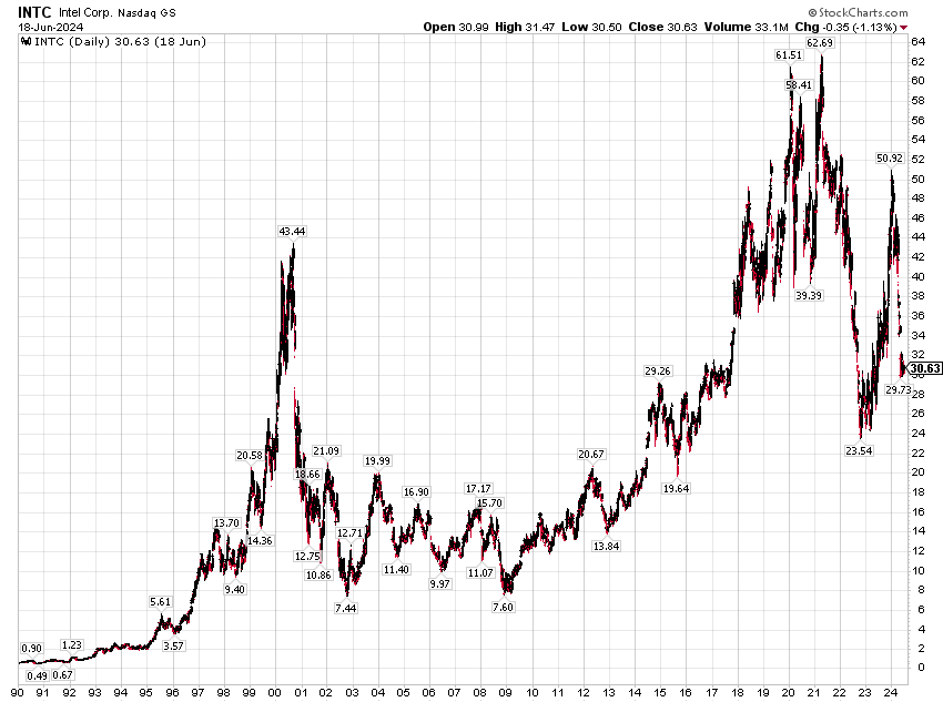 "Intel was as dominant today in the microprocessor market, the CPU market, in 2000 during the dotcom bubble, more so than Nvidia is dominant in GPU’s. Intel's market cap peaked in 2000 at $500 billion. We're seeing now Nvidia is $3.3 trillion, six plus times that now if you inflation-adjust...what happened to Intel? Well, Intel peaked at $76 in August, September of 2000, and fell 80-something percent when that bubble broke, and it never recovered. It's $30 today.”