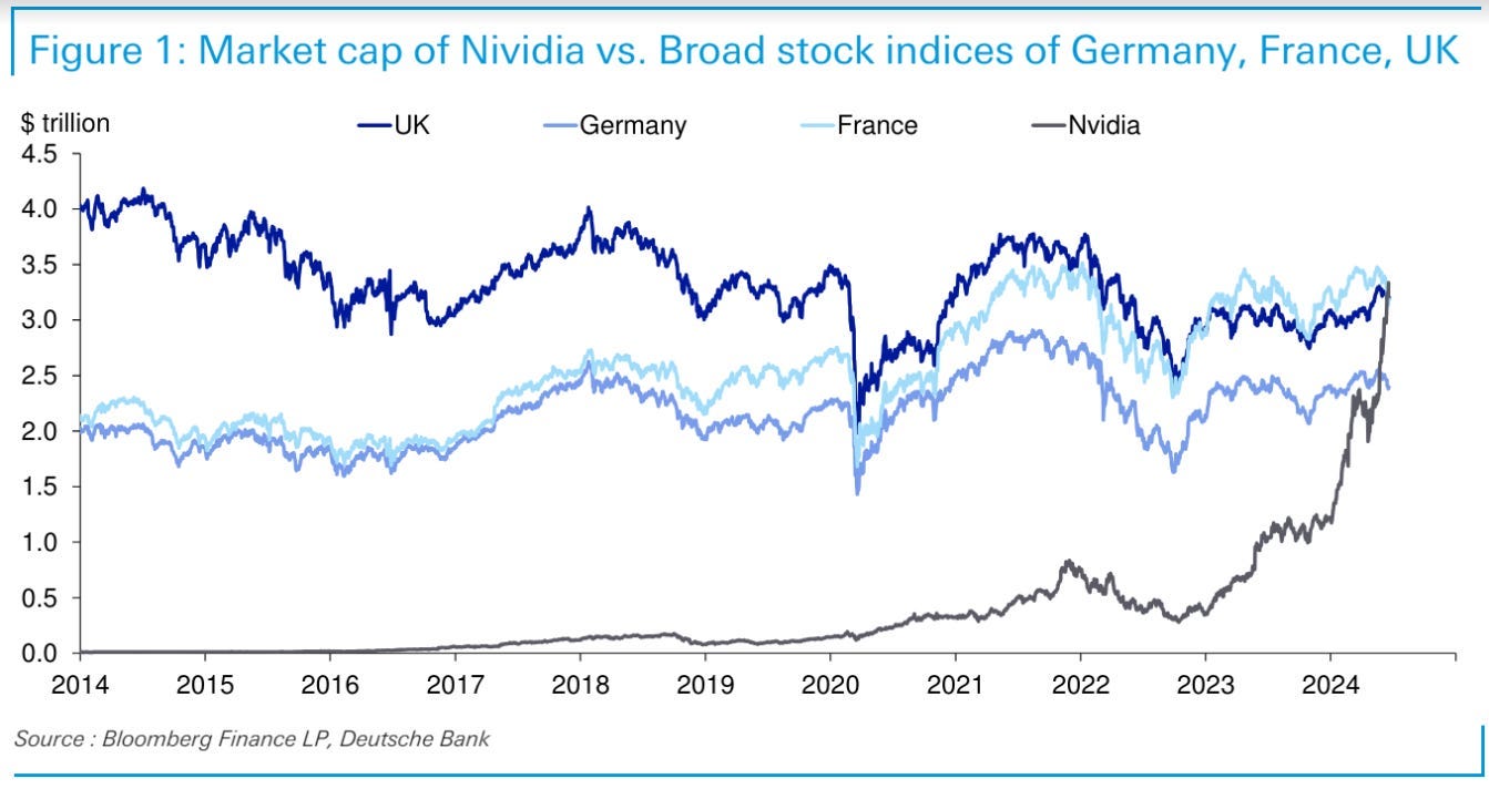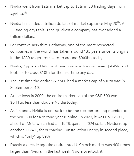 “Stunning. Nvidia passes Microsoft and Apple as largest market cap. Combined, the three are valued at $9.9 trillion, 21.5% of the entire market capitalization of the S&P 500. The three are today LARGER than the capitalization of the ENTIRE S&P in September 2011, not a market low.