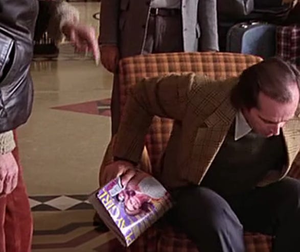 Never noticed until now that Jack Torrance was reading Playgirl magazine in the lobby of the Overlook Hotel.