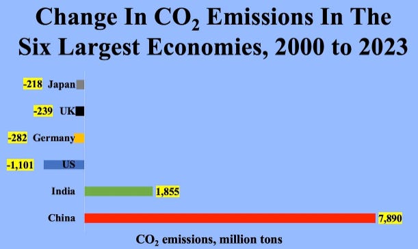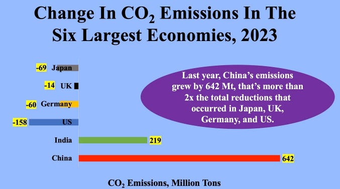 ”The U.S. again led the world in emissions reductions in 2023, but as shown in the previous two slides, those reductions are being swamped by the growth in India and China.”