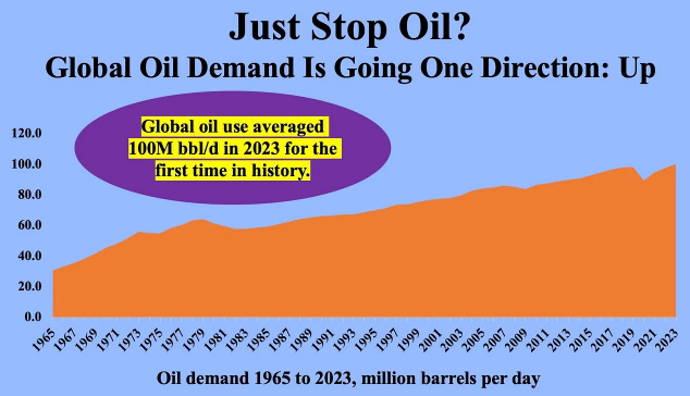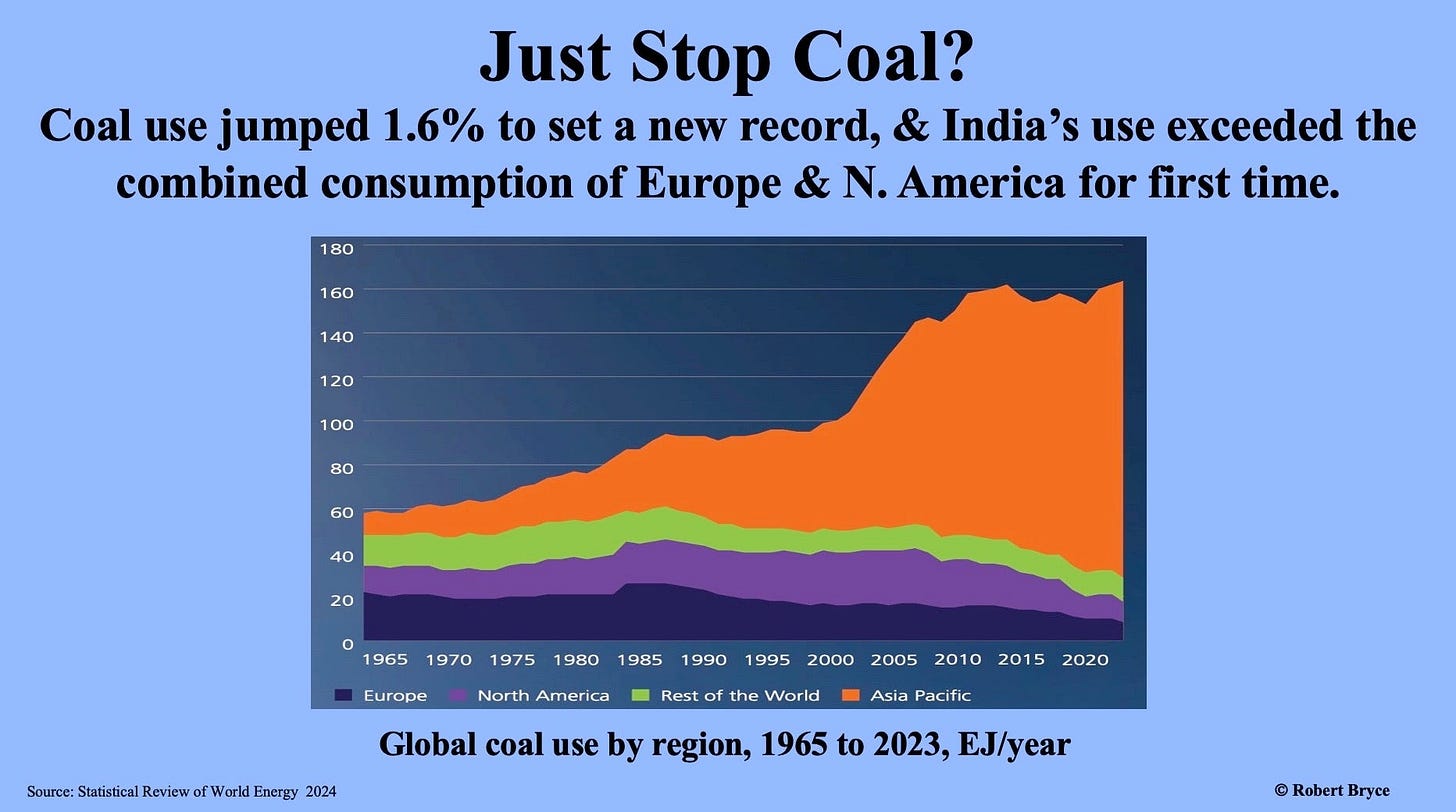“Global hydrocarbon use and CO2 emissions hit record highs in 2023, with hydrocarbon consumption up 1.5% to 504 exajoules (EJ). That increase was “driven by coal, up 1.6%, [and] oil up 2% to above 100 million barrels [per day] for the first time.” Global natural gas demand was flat, mainly due to stunning declines in Europe.”