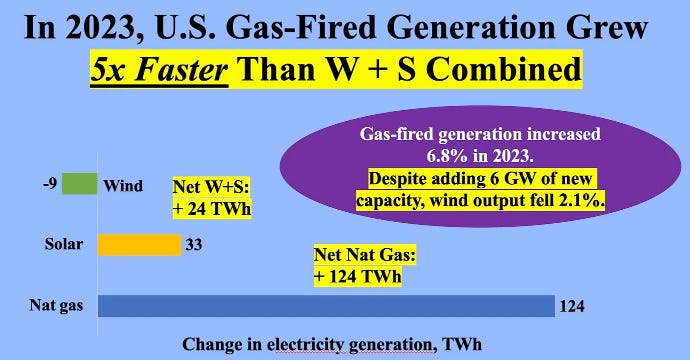 “The Inflation Reduction Act provides tens of billions of dollars in subsidies for wind and solar in the U.S. However, as seen below, gas-fired generation is still growing faster than those two sources combined. Note that in 2023, wind generation fell despite the addition of 6 gigawatts of capacity. Why? The wind didn’t blow.”