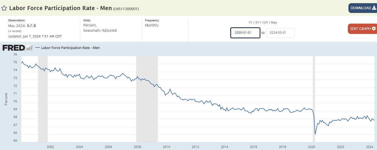 “I'm personally of the opinion that we have been in a silent depression - which is an Emil Kalinowski term from 2007 - that something broke. All of our trendlines broke. We have all these missing people from the workforce. We have all these missing men from the workforce, and people may say maybe they're taking care of kids - that's not what the data has borne out. The problem is is that we are just not producing like we used to produce, and I think that a lot of that has to do with companies are no longer interested in investing in productivity, investing in research and development - they're only interested in buybacks and making sure that their stock price looks good. Anybody who's been in Corporate America can tell you that by just telling you their story, so I think that's a lot of it.