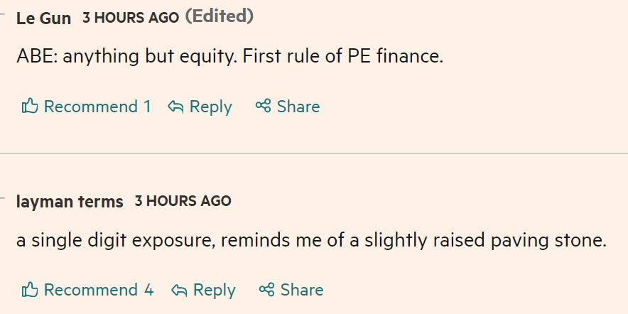 “With correct discipline low levels (debt vs uncalled investor capital) and with good quality investors (pension funds not private individuals) default risk is low (it’s as much a liquidity tool as operating leverage for the PE Fund) but it is all quite opaque and this kind of financial alchemy is both difficult to track and historically ends up being abused.