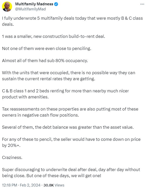 One of the things I heard is ‘we have to put money to work, because we've been on the sidelines for 18 to 24 months, we got to do a deal,’ and that really speaks to the heart of a lot of these private-equity groups, you know, maybe the Blackstones or some of these other big private-equity groups that have not made investments in the multifamily in the last 24 months, and some of their people that work for them…how do you justify your job if you're not really putting money into the deals?…how do we pay this guy $500,000 a year if he really hasn't done anything, or if she hasn't done anything?