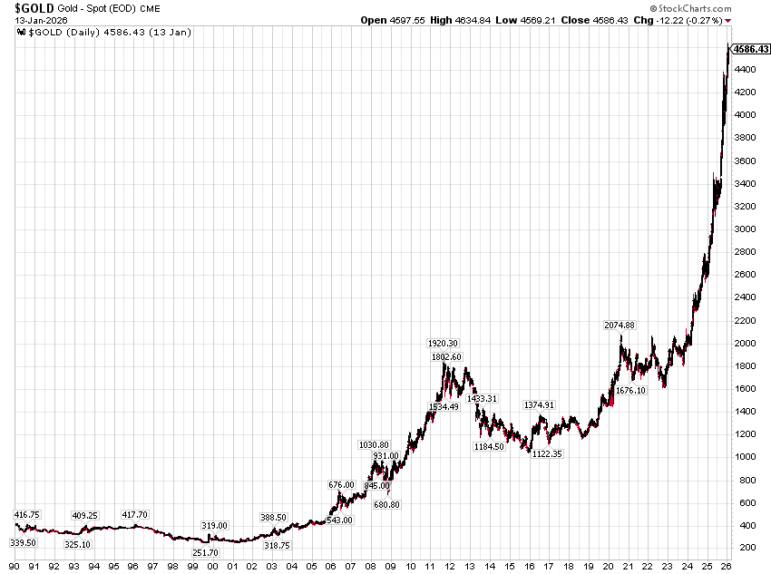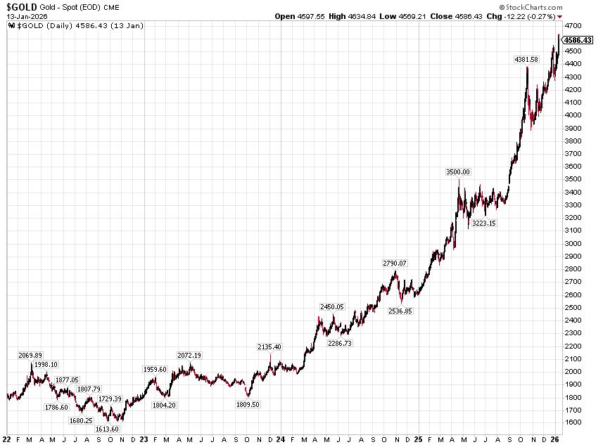 From 2022 until today (1/14/26), gold went from a major low of $1613.60 to $4586.43, 2.84x.