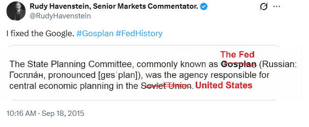 “The monetary system is a Marxist communist system. You have this politburo, the Federal Reserve board, a bunch of academics, a bunch of PhDs. That’s exactly what Gosplan was in the Soviet Union, a bunch of really smart people sitting in offices doing calculations about how many toothbrushes needed to be manufactured in the Soviet Union. And of course, you couldn’t get a good toothbrush, because central planning doesn’t work.