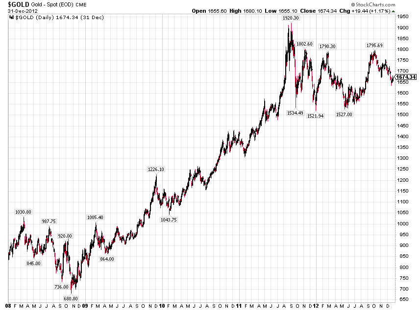 From 2008 to 2011, gold went from a major low of $680.80 to a peak of $1920.30, up 2.82x.