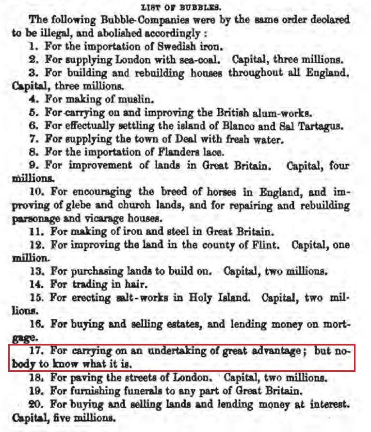 I’m reminded of this list of bubbles from the 1852 book, Memoirs of Extraordinary Popular Delusions and the Madness of Crowds: