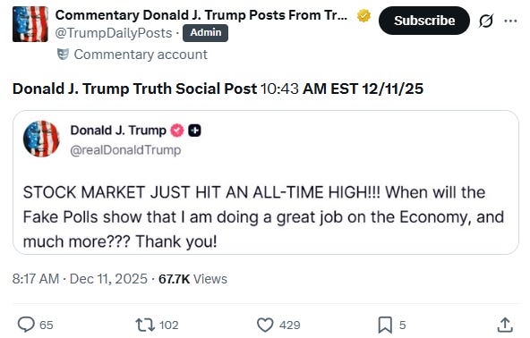 STOCK MARKET JUST HIT AN ALL-TIME HIGH!!! When will the Fake Polls show that I am doing a great job on the Economy, and much more??? Thank you!