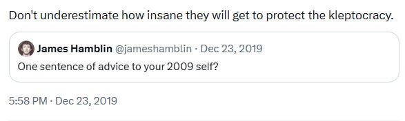“It is more and more looking like Argentina before the ouster of the Peronists. I don’t know. It’s quite concerning to me where we’re going. This must be the least conservative Republican administration on record. Certainly, it’s the most venal, by which I mean the most self-interestedly interested in money for itself.”